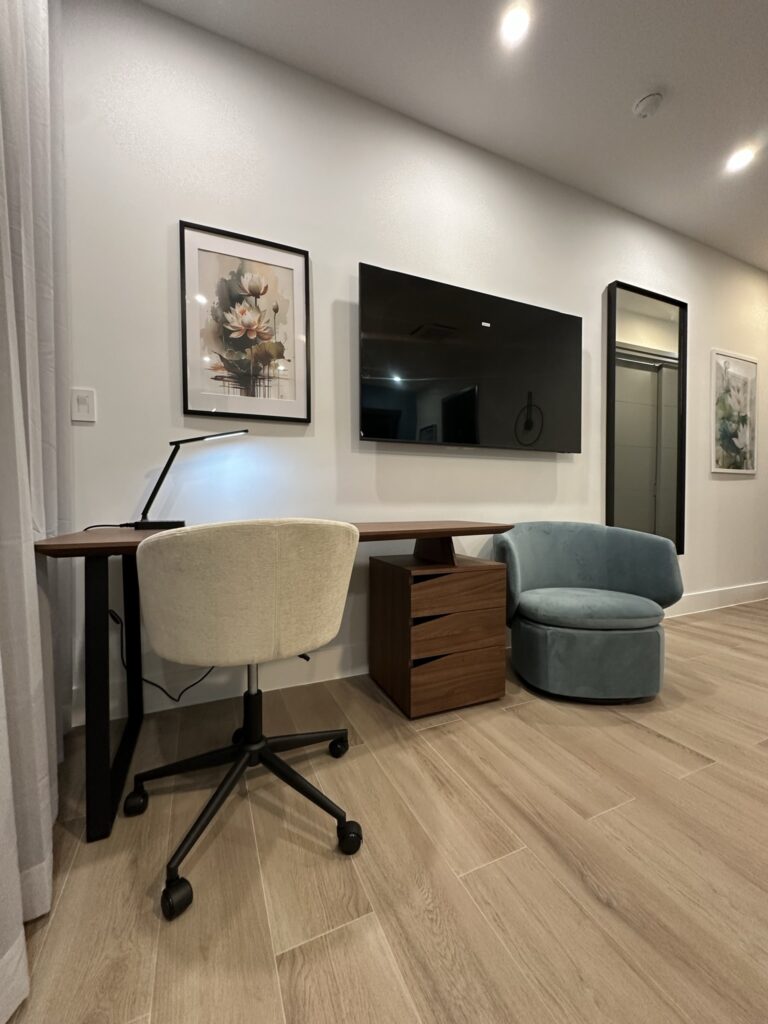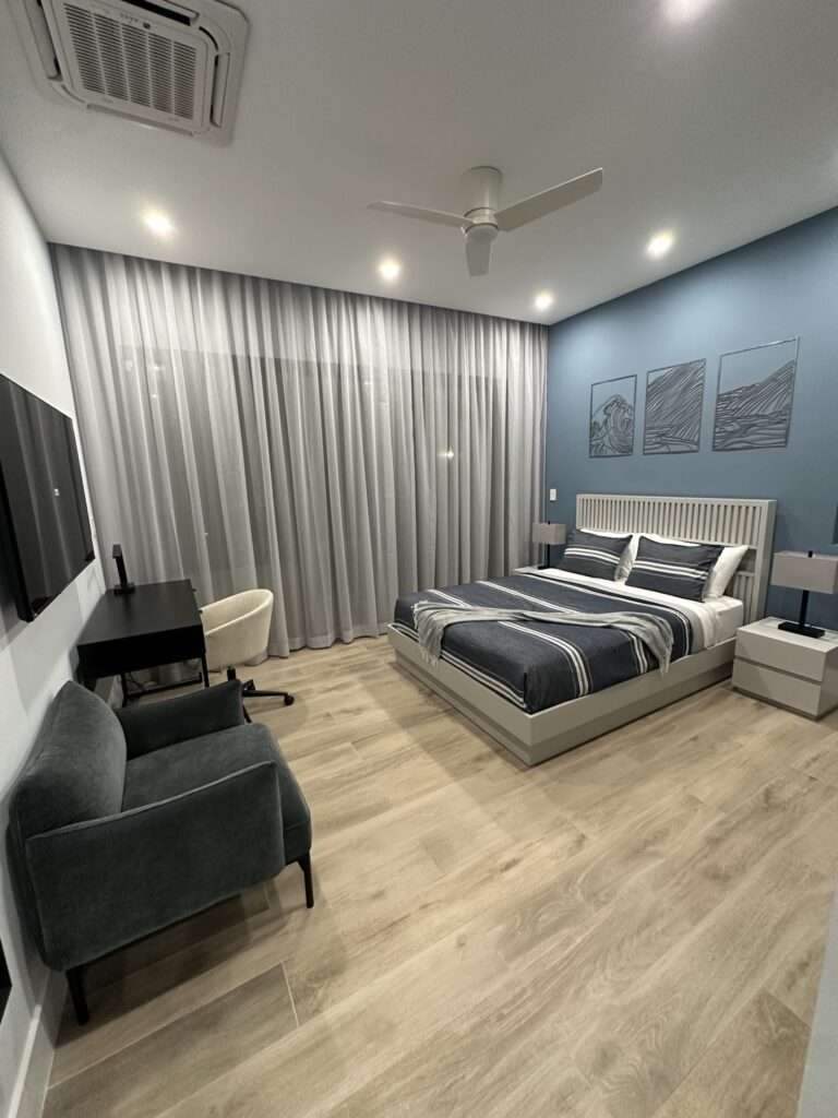 • Multifunctionality: Each bedroom includes desks, velvet chairs, and swivel seating, making them ideal for both relaxation and work.
