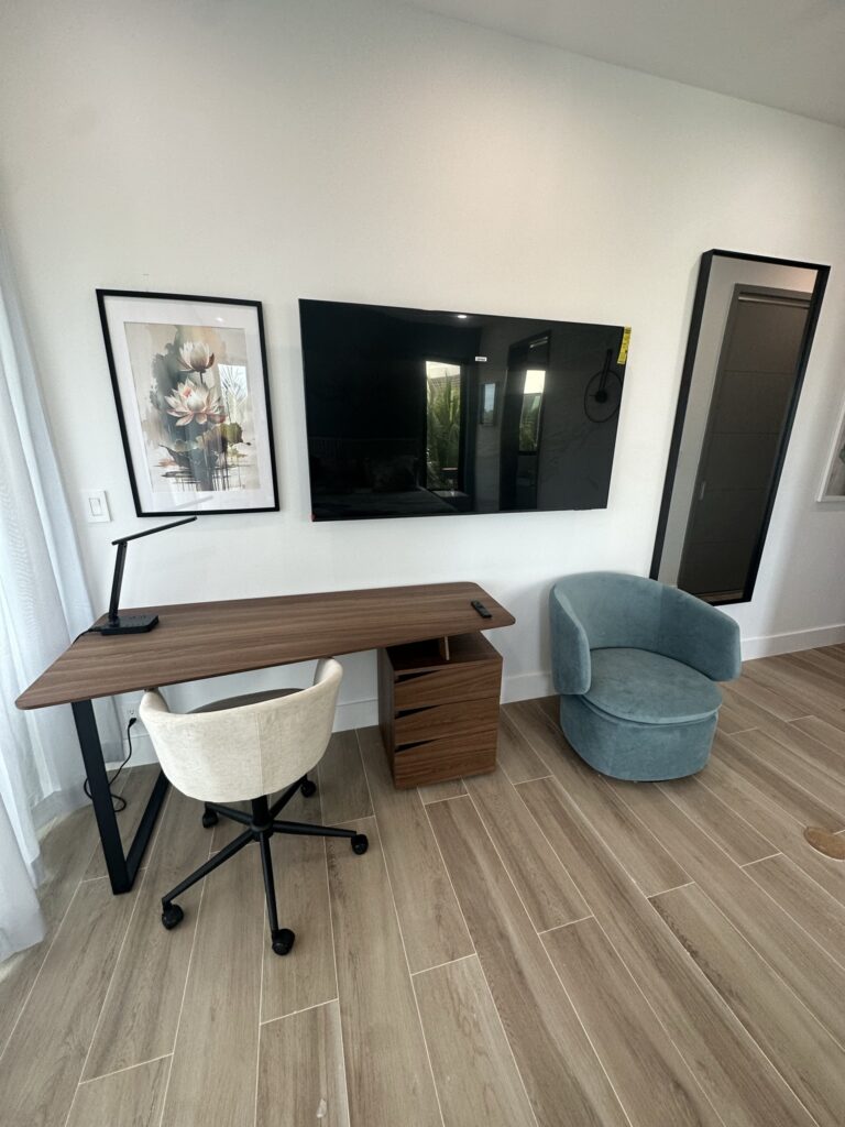 Multifunctional bedrooms: Work and leisure seamlessly integrated with velvet chairs, desks, and mirrors that expand the sense of space.